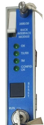 The Rack Interface Module (RIM) is the primary interface to the 3500 rack. It supports a proprietary protocol used to configure the rack and retrieve machinery information. The RIM must be located in slot 1 of the rack (next to the power supplies).